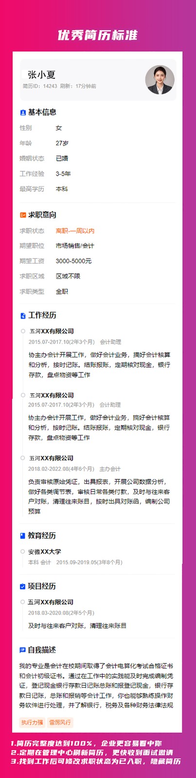 为了帮助人才更好的展示自己,更快速找到工作,五河招聘平台发布优秀简历标准如下: