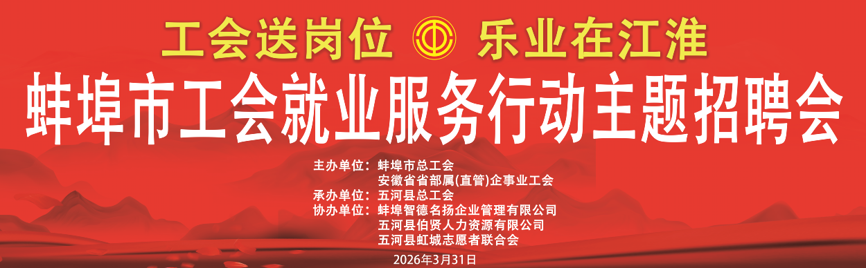 2026年3月31日上午9:00 在五河县青年圩广场举行蚌埠市工会就业服务行动主题招聘会!!!